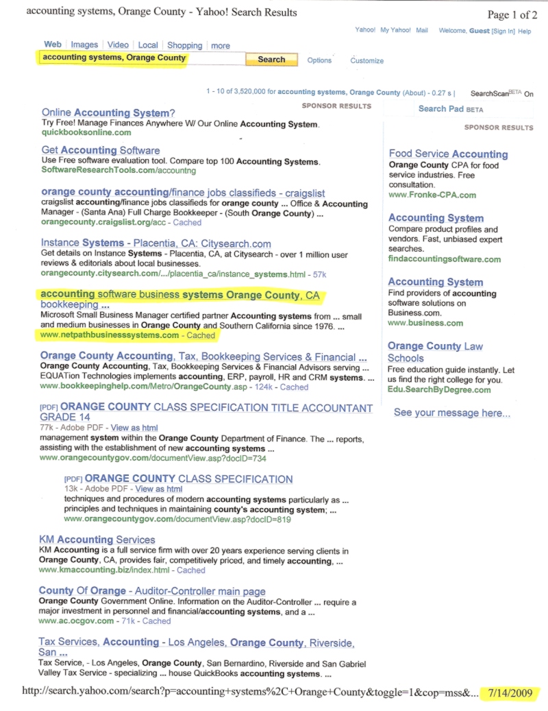 - Again, as above, we note that for December 2004 - this phrase brings up our website - NetPathBusinessSystems.com, as the first search result on page one. As of August of 2009, the website still places on page one of Yahoo.